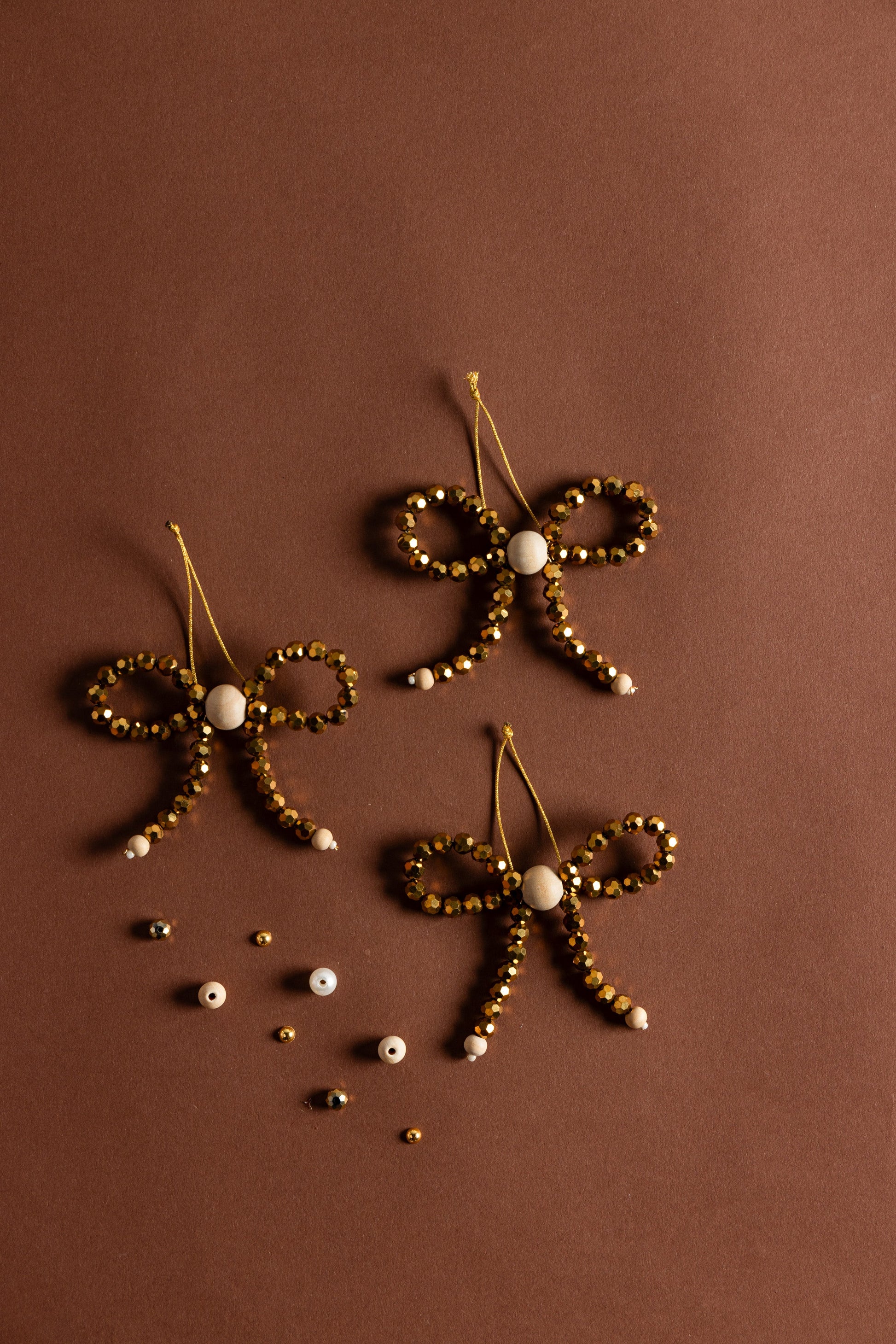 Decorate your tree with the handmade Gold Bows Set, crafted from sparkling crystal beads. Each ornament reflects festive light beautifully, adding a touch of elegance and shine to your Christmas celebrations.Set includes 3 ornaments.