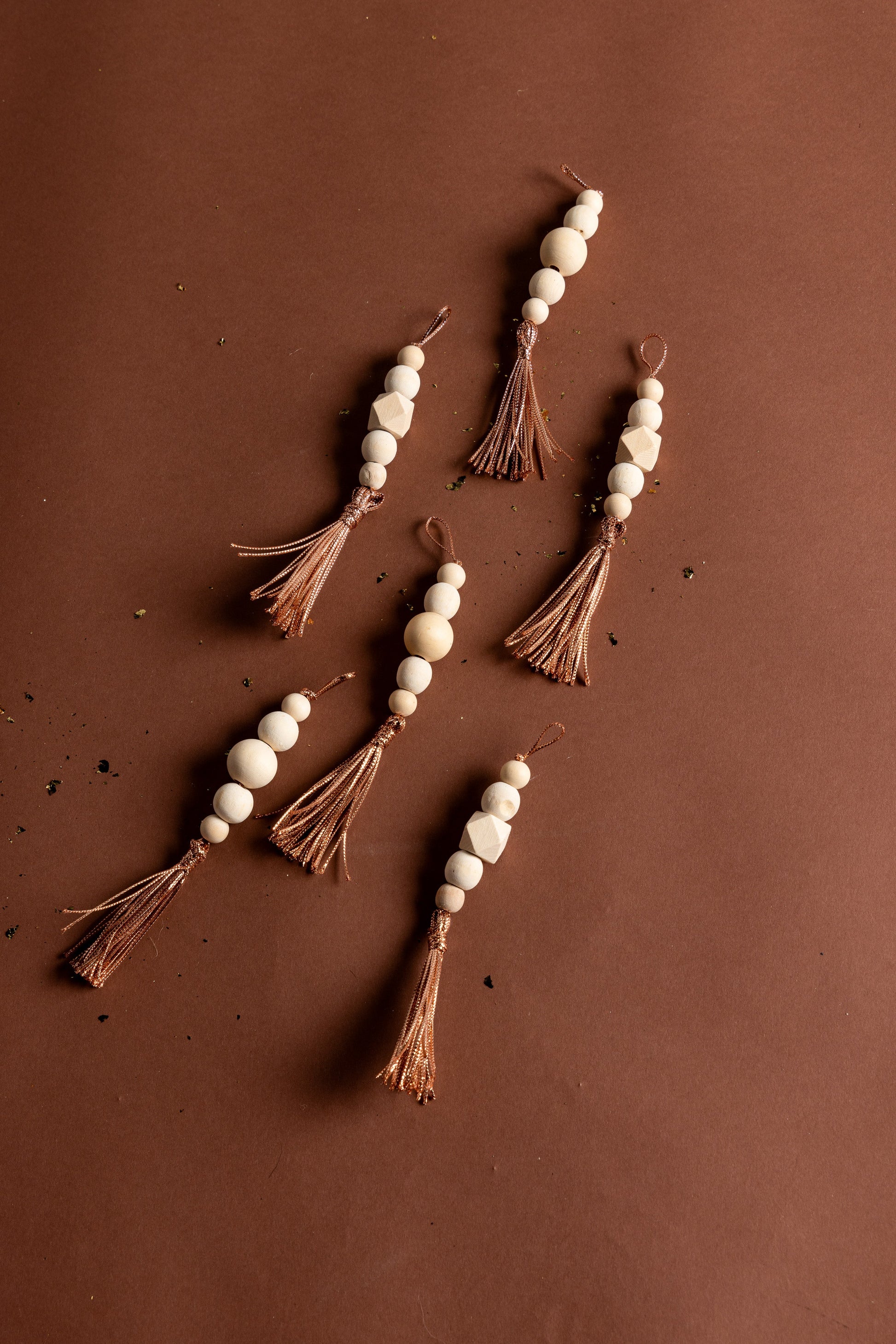 Decorate your tree with style this holiday season! This set of 6 ornaments are made with wood beads and handmade tassels, adding a touch of charm and warmth to your home. Hang them on your tree or use them as charming accents throughout your space.